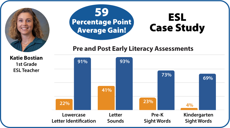 I recently analyzed data from Katie Bostian, a dedicated 1st Grade ESL Teacher at Knollwood Elementary (Rowan-Salisbury Schools). Katie worked with two small groups of English Learners using a structured, multi-sensory approach with Letters alive®.